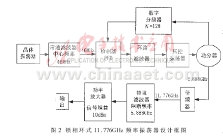 在該頻率振蕩器系統(tǒng)中,利用高穩(wěn)定晶體振蕩源輸出信號(hào)經(jīng)過(guò)中心頻率為46MHz帶通濾波器,提供一個(gè)高精確的穩(wěn)定參考信號(hào)至檢相器,鎖相環(huán)路分頻計(jì)數(shù)器設(shè)置為128,達(dá)到鎖相后VCO輸出5.888GHz固定點(diǎn)頻信號(hào),再經(jīng)過(guò)高頻電路倍頻獲得11.776GHz的二次諧波。由于采用的倍頻器基波抑制性能較差,需要通過(guò)阻帶濾波和功率放大獲得足夠功率的高穩(wěn)定低相位噪聲的高純度11.776GHz振蕩信號(hào)。圖2為整個(gè)頻率振蕩器系統(tǒng)的設(shè)計(jì)框架。