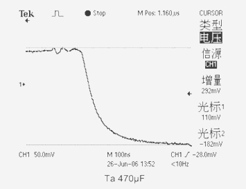 2、當(dāng)測試電容為(Ta)鉭電解電容器CT=470μF ESR=149mΩ時(shí),輸出電壓下跌值為292mV。