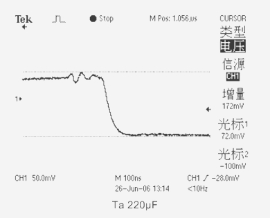 3、當(dāng)測試電容為(Ta)鉭電解電容器CT=220μF ESR=73mΩ時(shí),輸出電壓下跌值為172mV。