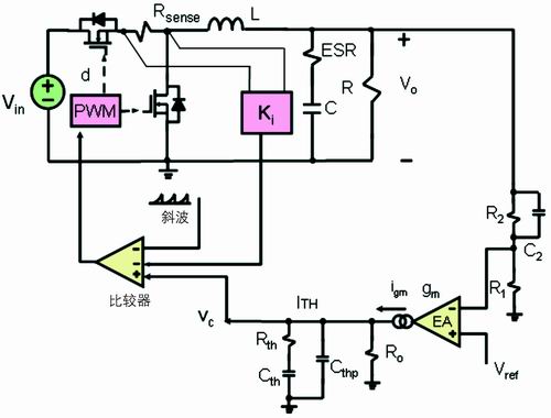 電流取樣電阻在輸入端的降壓轉(zhuǎn)換器如圖1所示。在電流模式的降壓轉(zhuǎn)換器拓樸結(jié)構(gòu)中,反饋有兩個(gè)環(huán)路:一個(gè)電壓外環(huán),另一個(gè)是電流內(nèi)環(huán)。電壓外環(huán)包括電壓誤差放大器、反饋電阻分壓器和反饋補(bǔ)償環(huán)節(jié)。電壓誤差放大器的同相端接一個(gè)參考電壓Vref,反饋電阻分壓器連接到電壓誤差放大器反相端VFB,反饋環(huán)節(jié)連接到VFB和電壓誤差放大器的輸出端VC。若電壓型放大器是跨導(dǎo)型放大器,則反饋環(huán)節(jié)連接到電壓誤差放大器的輸出端VITH和地。目前,在高頻DC/DC的應(yīng)用中,跨導(dǎo)型放大器應(yīng)用更多。本文就以跨導(dǎo)型放大器進(jìn)行討論。輸出電壓微小的變化反映到VFB引腳,VFB引腳電壓與參考電壓的差值被跨導(dǎo)型放大器放大,然后輸出,輸出值為VITH。跨導(dǎo)型放大器輸出連接到電流比較器的同相端,電流比較器的反相端輸入信號(hào)為電流檢測(cè)電阻的電壓信號(hào)VSENSE。由此可見(jiàn),對(duì)于電流比較器,電壓外環(huán)的輸出信號(hào)作為電流內(nèi)環(huán)的給定信號(hào)。對(duì)于峰值電流模式,工作原理如下:在時(shí)鐘同步信號(hào)到來(lái)時(shí),高端的主開(kāi)關(guān)管開(kāi)通,電感激磁,電流線性上升,電流檢測(cè)電阻的電壓信號(hào)也線性上升。由于此時(shí)電壓外環(huán)的輸出電壓信號(hào)高于電流檢測(cè)電阻的電壓,電流比較器輸出為高電壓;當(dāng)電流檢測(cè)電阻的電壓信號(hào)繼續(xù)上升,直到等于電壓外環(huán)的輸出電壓信號(hào)時(shí),電流比較器輸出翻轉(zhuǎn),從高電平翻轉(zhuǎn)為低電平,邏輯控制電路工作,關(guān)斷高端主開(kāi)關(guān)管的驅(qū)動(dòng)信號(hào),高端的主開(kāi)關(guān)管關(guān)斷,此時(shí)電感開(kāi)始去磁,電流線性下降,到下一個(gè)開(kāi)關(guān)周期開(kāi)始的時(shí)鐘同步信號(hào)到來(lái),如此反復(fù)。