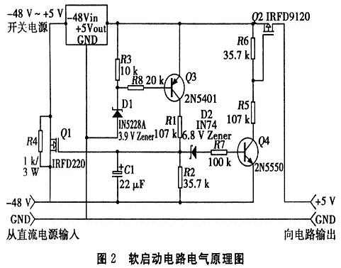 下面采用一個從-48V~+5V的開關電源路論述“軟啟動”技術。所用的開關電源是一個含有LT1172HVCT的穩(wěn)壓器,從負到正補償提升式(buck-boost)轉(zhuǎn)換器,其實任何一個從-48V~+5V的開關電源都能工作。其中,軟啟動電路和開關電源電路是相互獨立的,電氣原理如圖2所示。
