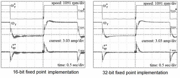 比例積分控制器的積分項(xiàng)總是采用 32 位字長(zhǎng)甚至是 16 位定點(diǎn)版本,根據(jù)以往的經(jīng)驗(yàn),采用 16 位積分累加的結(jié)果明顯地差的多。采用類(lèi)似仿真的策略將 ±0.5 pu 的步長(zhǎng)應(yīng)用于系統(tǒng)速度參考。d 軸及 q 軸電流和估測(cè)速度作為速度命令的步長(zhǎng),這些也證實(shí)了仿真結(jié)果。在瞬態(tài)及穩(wěn)態(tài)狀態(tài)下,仿真結(jié)果的響應(yīng)相關(guān)性很強(qiáng)。不良振蕩瞬態(tài)及因采用 16 位實(shí)施造成的瞬態(tài)時(shí)間增加等情況下的量化效應(yīng)是可以驗(yàn)證的。