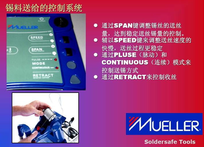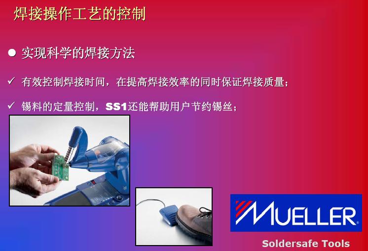 在發(fā)熱功率方面的提高,我們碰到另外一個(gè)問題。我們也可以看到951和937,還有新推出來機(jī)器,我們將發(fā)熱功率進(jìn)行對(duì)比。他們也花了很多研發(fā)精力來提高發(fā)熱功率,如果在提高發(fā)熱功率之后,確實(shí)能提高生產(chǎn)效率,但是它是不是可以被無限制提升呢?現(xiàn)在的機(jī)器比如到150瓦到160瓦,已經(jīng)上升了3倍,是否還會(huì)提高到4倍,這一個(gè)效率的提高導(dǎo)致整體效率的提高,我個(gè)人不是很贊同。其實(shí)這是比較系統(tǒng)性的解決方案,我們看到MUELLER是通過對(duì)工藝改進(jìn)達(dá)到更高的焊接效率。在談到這款機(jī)器之前,我們回顧一下傳統(tǒng)焊接方法作業(yè)的特點(diǎn),我們的圖從左到右看,整個(gè)工藝從加熱到預(yù)熱,再繼續(xù)加熱,第四步是添加焊心,然后取走焊嘴,這是非常傳統(tǒng)的焊接工藝,反過來看,我們看到整個(gè)焊接過程中,雙手是被限制的。從第二張圖開始,都是靠手去拿,關(guān)鍵是控制在雙手被占用。過程等待時(shí)間會(huì)很長(zhǎng),我們可以看到實(shí)際作業(yè)過程中下面三步是真正起到作用,前面預(yù)熱當(dāng)然是準(zhǔn)備工作,但是在這個(gè)工作中,我們雙手等待的時(shí)間會(huì)非常長(zhǎng)。第三個(gè),作業(yè)效率不是特別穩(wěn)定,因?yàn)槲覀兯湾a的時(shí)候,以及拿走錫絲過程中依賴員工本身的技巧和技術(shù)。