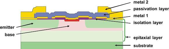 通過選擇不同的低電阻襯底,比如:圖1所示的摻磷/摻砷襯底,可以有效降低半導體中的電壓降比例。另一個重要的影響因素是電流分配,應(yīng)在整個芯片范圍內(nèi)盡可能保持均衡,將芯片前端金屬化擴展電阻降至最低。對于BISS晶體管,芯片中的均衡電流分配通過一種稱為網(wǎng)格技術(shù)的手段來實現(xiàn)——將晶體管分成不同的格柵結(jié)構(gòu)。第四代BISS晶體管采用受專利保護的雙層金屬化布局,能夠最大程度提升發(fā)射極線路金屬厚度,降低飽和電阻(參見圖2)。
