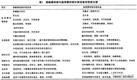 利用接觸器控制補(bǔ)償設(shè)備與用晶閘管控制方法來(lái)補(bǔ)償設(shè)備的性能比較如表1所列。