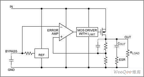 低壓差線性穩(wěn)壓器(LDO)的結(jié)構(gòu)主要包括啟動電路、恒流源偏置單元、使能電路、調(diào)整元件、基準源、誤差放大器、反饋電阻網(wǎng)絡(luò),保護電路等,基本工作原理是這樣的:系統(tǒng)加電,如果使能腳處于高電平時,電路開始啟動,恒流源電路給整個電路提供偏置,基準源電壓快速建立,輸出隨著輸入不斷上升,當(dāng)輸出即將達到規(guī)定值時,由反饋網(wǎng)絡(luò)得到的輸出反饋電壓也接近于基準電壓值,此時誤差放大器將輸出反饋電壓和基準電壓之間的誤差小信號進行放大,再經(jīng)調(diào)整管放大到輸出,從而形成負反饋,保證了輸出電壓穩(wěn)定在規(guī)定值上;同理如果輸入電壓變化或輸出電流變化,這個閉環(huán)回路將使輸出電壓保持不變,即: