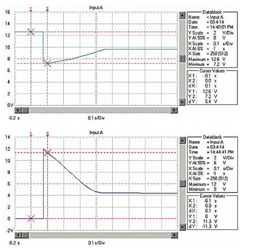 由于RM、RB、RL均非常低,啟動電流非常大。例如用12V、45Ah的蓄電池啟動安裝1.9升柴油機(jī)的汽車,蓄電池的電壓在啟動瞬間由12.6V降到約3.6V!啟動過程的蓄電池電壓波形如圖1;啟動瞬時(shí)的電流達(dá)550A,約為蓄電池的12C的放電率!啟動過程的蓄電池電流波形如圖2,(電流傳感器的電流/電壓變換比率:100A/V)。盡管車用蓄電池是啟動專用蓄電池,可以高倍率放電,但在圖1中可以看出,10倍以上的高倍率放電時(shí)的蓄電池性能變得很差,而且,如此高倍率放電對蓄電池的損傷也是非常明顯的。啟動過程的電壓劇烈變化也是極強(qiáng)的電磁干擾,可以造成電氣設(shè)備的“掉電”,迫使電氣設(shè)備在發(fā)電機(jī)啟動過程結(jié)束后重新上電,計(jì)算機(jī)在這個(gè)過程中非常容易死機(jī)。因此,無論從改善汽車電氣設(shè)備的電磁環(huán)境還是改善汽車的啟動性能和蓄電池的性能、延長使用壽命來考慮,改善汽車電源在啟動過程的性能是必要的。