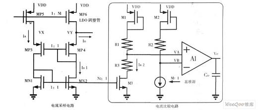 如圖1所示,電流采樣電路包括MP5、MP4、MP3、MN2和MN1。因?yàn)镸P5和MP6均工作在飽和區(qū),為了使MP5更好地等比例鏡像LDO的調(diào)整管(PMOS驅(qū)動(dòng)管)MP6的電流,特使用MN1、MN2、MP3和MP4組成自偏置的鏡像陣列,以保證VX=VY,Vds_p5=Vds_p6。所以根據(jù)飽和區(qū)電流公式得到,N1I_p5=N1Is=N1Is1=I_p6。為使M3電流與Is更好的匹配,根據(jù)經(jīng)驗(yàn)值并考慮功耗因素,特意將MN1、MN2和M3的過飽和電壓提高到0.3V。