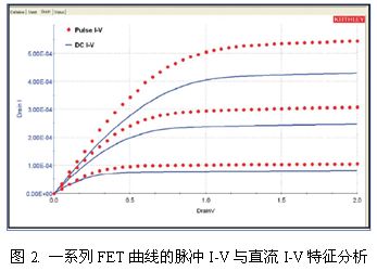 利用這種工具套件,研究人員可以同時進(jìn)行直流和脈沖IV測試以掌握器件特性,例如如圖2所示的FET器件系列特征曲線。