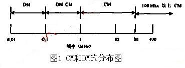 EMI信號(hào)包括共模干擾信號(hào)CM和差模干擾信號(hào)DM,CM和DM分布如圖1所示。它可用來指導(dǎo)如何確定EMI濾波器網(wǎng)絡(luò)結(jié)構(gòu)和參數(shù)。