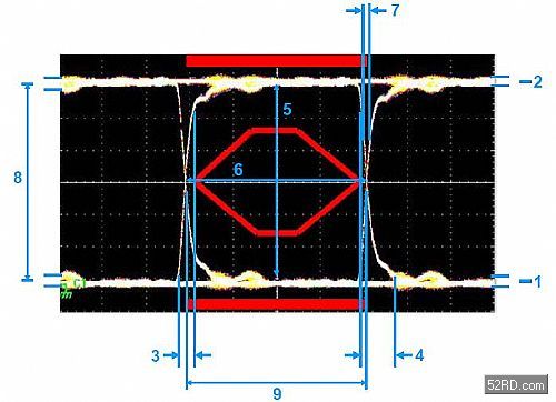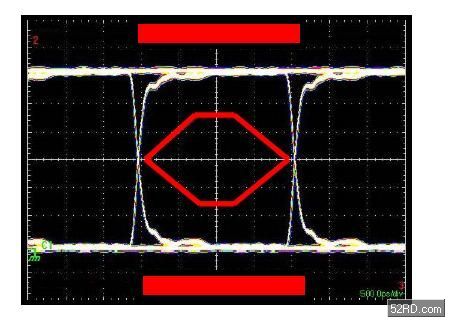 通過在示波器的垂直軸對數(shù)字信號(hào)進(jìn)行反復(fù)采樣、同時(shí)采用相應(yīng)數(shù)據(jù)率對水平時(shí)間掃描進(jìn)行觸發(fā)來生成眼圖。所獲得的圖形看上去象眼睛,如圖1所示。“眼睛”越大,數(shù)據(jù)完整性越高。通常采用模板(mask)來對可接受的信號(hào)質(zhì)量進(jìn)行定義。這模板由“眼睛”中間的六角形和“眼睛”上、下的矩陣組成。如果測得的信號(hào)跡線穿越模板的邊線,那么信號(hào)質(zhì)量就不可接受。USB2.0信號(hào)模板規(guī)范由USB應(yīng)用者論壇(USBIF,www.usb.org)提供,可參見USB2.0版規(guī)范第7.1.2.2章節(jié)。圖1中顯示了帶有詳細(xì)臨界點(diǎn)的眼圖。
