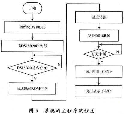 蓄電池溫度監(jiān)測系統(tǒng)的軟件設計主要包括主程序、外部中斷子程序、顯示子程序等。圖6是該系統(tǒng)的主程序流程圖。用于完成對DS18B20的調用、中斷管理、測量溫度值的計算及溫度值的顯示等功能。主機89S51首先復位脈沖使信號線上所有的DS18B20芯片都被復位,接著發(fā)送跳過ROM操作命令,激活在線的所有DS18B20,然后系統(tǒng)轉人中斷處理流程,完成溫度轉換,讀取等工作。外部中斷子程序完成對溫度測量數(shù)據(jù)的讀取,顯示子程序完成液晶顯示器的初始化及顯示溫度值。