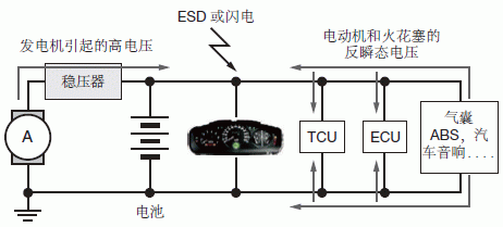 電子控制單元、傳感器和信息娛樂系統(tǒng)等汽車電子設(shè)備連接在一根電源線上(圖4)。這些電子產(chǎn)品的電源是電池和交流發(fā)電機,這兩種電源的輸出電壓都不穩(wěn)定,容易受溫度、工作狀態(tài)和其他條件影響。此外,使用燃油噴射系統(tǒng)、閥、電機、電氣和水解控制器等電磁線圈負載的汽車系統(tǒng),會把ESD、尖峰噪聲和其他類型的瞬態(tài)和浪涌電壓引入到電源和信號線上。