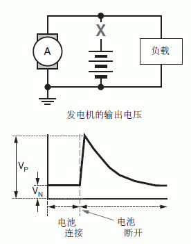 最糟糕的浪涌電壓發(fā)生在引擎運轉(zhuǎn)時電池斷開,交流發(fā)電機為汽車電源線提供電流時,這種情況就是所說的“甩負荷”。大多數(shù)汽車制造商和工業(yè)協(xié)會都會為這種甩負荷狀態(tài)制定最高電壓、線路阻抗和這種甩負荷狀態(tài)的持續(xù)時間,如圖5所示。甩負荷的電源阻抗會高于正常瞬態(tài)測試時的電源阻抗,因為電池斷開而只有發(fā)電機在向外輸出電能,這時交流發(fā)電機的內(nèi)部線圈相當(dāng)于一個限流電阻。