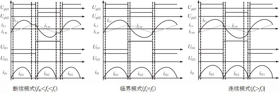 諧振網(wǎng)絡(luò)由諧振電感L r、諧振電容C r、激磁電感L m組成。圖2為其主要的理想工作波形,根據(jù)工作頻率的不同,我們可以把它分為三個(gè)模式,即斷續(xù)模式(fw<fs<fr)、臨界模式(fs=fr)和連續(xù)模式(fs>fr),其中fw為第一諧振頻率,fr為第二諧振頻率,fs為開關(guān)管工作頻率。