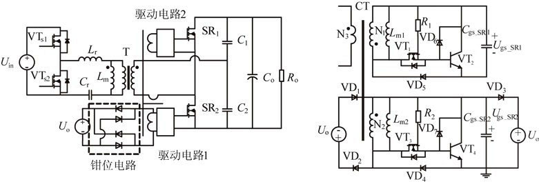 圖7為幾種典型的電流型驅(qū)動(dòng)方案。傳統(tǒng)的電流型驅(qū)動(dòng)方案如圖7(a)所示,整個(gè)驅(qū)動(dòng)電路包括一個(gè)電流互感器(CT)和一個(gè)電壓箝位電路。電路通過電流互感器對(duì)電流信號(hào)進(jìn)行采樣,并給同步管提供相應(yīng)的驅(qū)動(dòng)信號(hào),多余的驅(qū)動(dòng)能量被箝位電路消耗。該驅(qū)動(dòng)電路比較簡(jiǎn)單,但是有較大的驅(qū)動(dòng)損耗,限制了變流器效率的提高。因此有文獻(xiàn)提出了具有剩余驅(qū)動(dòng)能量回饋功能的電流型驅(qū)動(dòng)方案,如圖7(b)所示。該驅(qū)動(dòng)電路中多余的驅(qū)動(dòng)能量能通過輔助繞組回饋到主電路,從而可以較大的減少驅(qū)動(dòng)電路的損耗,并簡(jiǎn)化電流互感器的設(shè)計(jì),但是多繞組的電流互感器大大增加了生產(chǎn)成本。另有文獻(xiàn)提出了一種更為簡(jiǎn)單的電流型驅(qū)動(dòng)方案,如圖7(c)所示。該方案的電流互感器只需一個(gè)副邊繞組,同時(shí)也具有剩余驅(qū)動(dòng)能量回饋的功能,更加有利于實(shí)際的生產(chǎn)應(yīng)用。通過三極管VTd1,它可以準(zhǔn)確地檢測(cè)同步整流管應(yīng)該關(guān)斷的時(shí)刻,從而保證了同步整流電路的可靠性。
