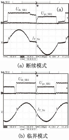 本文針對(duì)倍壓整流結(jié)構(gòu)提出的一種新型的電流型同步整流方案,如圖10所示。通過一個(gè)雙繞組電流互感器,既解決了二次側(cè)上管驅(qū)動(dòng)電路采樣的能量回饋問題,又減少了電流互感器的數(shù)量,有利于降低生產(chǎn)成本,提高變換效率及功率密度。圖11為斷續(xù)模式和臨界模式下的主要實(shí)驗(yàn)波形。
