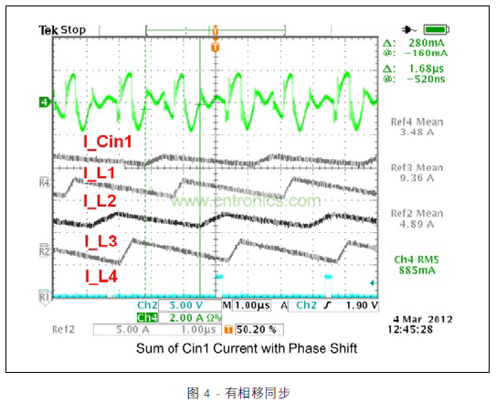 圖 3 顯示的范圍圖片涵蓋所有四個開關(guān)階段中的電感器電流與去耦合通道 1 的輸入電容器的脈沖電流。