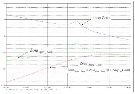 圖1 閉環(huán)輸出阻抗峰值Zout出現(xiàn)在控制環(huán)路交叉頻率處