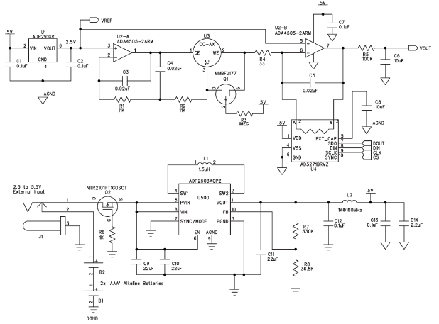 圖2給出了該便攜式氣體探測器的電路。雙通道微功耗放大器 ADA4505-2在恒電位配置(U2-A)和跨導(dǎo)配置(U2-B)下使用。該放大器的功耗和輸入偏置電流非常低,對于恒電位部分和跨導(dǎo)部分都是很好的選擇。每個放大器的功耗僅10 μA,因此電池壽命非常長。