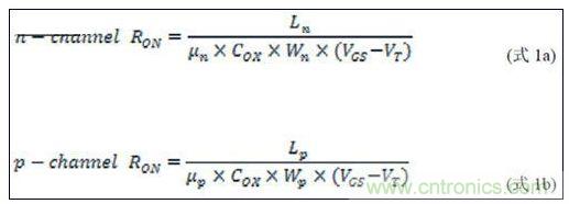 在VIN為各種電平條件下,p溝道和n溝道RON的并聯(lián)值形成并聯(lián)結(jié)構(gòu)的RON特征(圖2)。RON隨VIN的變化曲線在不考慮溫度、電源電壓和模擬輸入電壓對(duì)RON影響的情況下為直線。為使信號(hào)損耗和傳輸延遲最小,理想情況下的RON應(yīng)盡量小。然而,降低RON將增大MOSFET硅片的寬度/長(zhǎng)度(W/L)比,從而造成較高的寄生電容和較大的硅片面積。這種較大的寄生電容降低模擬開(kāi)關(guān)的帶寬。如果不考慮W和L,RON是電子和空穴遷移率(μn和μp)、氧化物電容(COX)、門限電壓(VT)及信號(hào)電壓、n溝道及p溝道MOSFET的信號(hào)電壓VGS (VIN)的復(fù)合函數(shù),如式1a和1b所示。