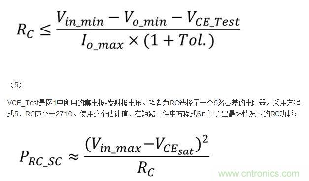 電阻器RC將會滿足輸出調節(jié)要求,并能在短路事件中耗散功率。筆者可計算出RC的值:
