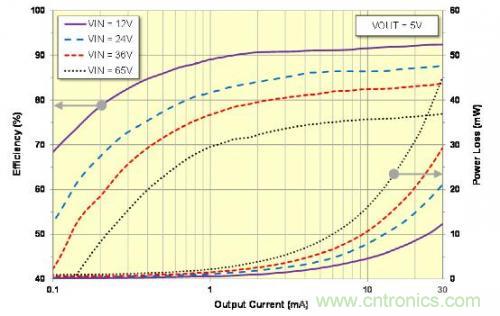 LM5165 中內(nèi)置的面向智能傳感器應(yīng)用的各種特性包括一種用于實(shí)現(xiàn)最佳解決方案尺寸的簡(jiǎn)單控制架構(gòu)、用于提供低壓差的 100% 占空比能力、一個(gè)用于電源軌排序和故障報(bào)告的漏極開路電源良好指示電路、在內(nèi)部固定或從外部可調(diào)的軟起動(dòng) (SS)、以及具有可定制遲滯以提供可編程線路欠壓閉鎖 (UVLO) 功能的高精度啟用。而且,一種可調(diào)的逐周期電流限制優(yōu)化了電感器選擇和尺寸。圖 3 顯示出了對(duì)于 0.1mA 至 30mA 負(fù)載電流的轉(zhuǎn)換器效率和功率耗散。