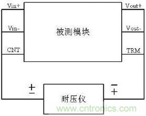 作為模塊電源的重要指標(biāo),標(biāo)準(zhǔn)中也規(guī)定了隔離耐壓相關(guān)測(cè)試方法,簡(jiǎn)單的測(cè)試時(shí)一般采用等電位連接測(cè)試,連接示意圖如下:
