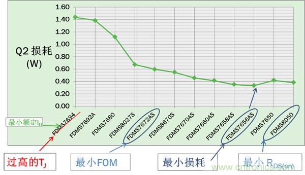對(duì)于Q2,VIN= VINMAX時(shí)損耗最大。圖3所示的12個(gè)器件中,F(xiàn)DMS7656AS有最低的最大損耗。但由于Q2 寄生參數(shù)會(huì)影響Q1的 開關(guān)損耗, 最小Q2 損耗通常并不意味著最佳的總能效。必須比較Q1及Q2的總功耗來找到最佳的Q2以實(shí)現(xiàn)最高能效。