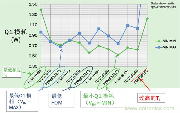 對(duì)于Q1,VIN= VINMAX或VINMIN時(shí)損耗最大。圖4所示的12個(gè)器件中,F(xiàn)DMS8027S和FDMS8023S分別在VIN= VINMAX和VINMIN時(shí)有最低的最大損耗的Q1。