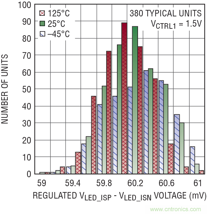 圖 1 顯示了當(dāng)模擬控制輸入為 0V 時(shí),隨溫度變化 LT3744 失調(diào)電壓的生產(chǎn)一致性,在這里,典型器件數(shù)量為 380 個(gè)。憑借誤差放大器的低失調(diào),控制環(huán)路在 1/20 標(biāo)度模擬調(diào)光時(shí),能夠?qū)崿F(xiàn) ±10% 的典型準(zhǔn)確度。圖 2 顯示了當(dāng)控制輸入等于 1.5V 時(shí),穩(wěn)定電壓在多個(gè) LED 電流檢測(cè)引腳上的分布。滿標(biāo)度范圍的準(zhǔn)確度好于 ±3%,這相當(dāng)于在 60mV 滿標(biāo)度調(diào)節(jié)電壓時(shí)準(zhǔn)確度為 ±1.8mV。