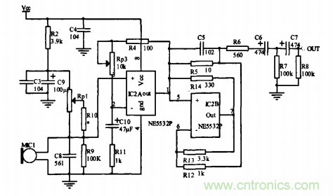監(jiān)控拾音器的輸出加入了由c6、R7、c 7、R8構(gòu)成兩級Rc高通濾波器,濾除信號中的高頻成分,同時電容又起了隔直的作用,使電路達到了較好的性能。