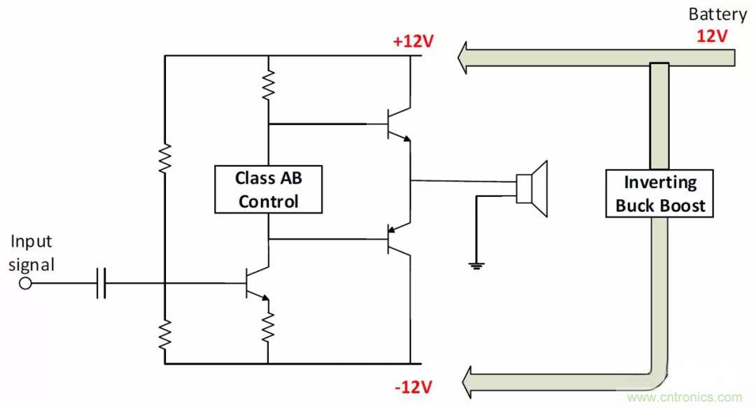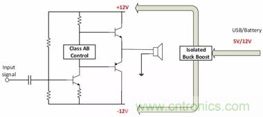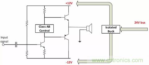 為這類應用選擇合適的拓撲時,需要考慮輸入電壓。例如,為以±12V軌運行的音頻放大器供電,如果輸入電源軌是24V,就選擇隔離式降壓拓撲。如果使用12V電池,就可以用反相降壓-升壓拓撲,以生成負壓軌。如果使用5V USB、12V電池或綠色能源供電的系統(tǒng),就應該采用隔離式降壓-升壓拓撲。圖12說明了如何用各種拓撲給音頻放大器供電。