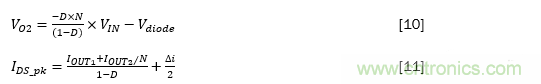 其中VIN是輸入電壓,VO2是次級輸出電壓,Vdiode是二極管正向壓降,D是占空比,N是變壓器匝數(shù)比,Ids_pk是通過頂部開關的峰值電流,△i是主電感器紋波電流的三角部分,IOUT1和IOUT2分別是由VO1和VO2,生成的輸出電流。