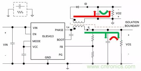 圖3.生成兩個+ VOUT軌的隔離式降壓拓撲(ISL85415DEMO2Z)