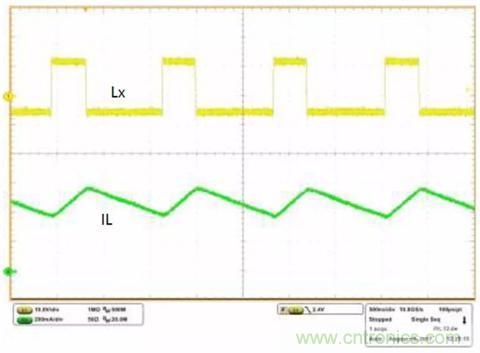 圖6. ISL85415EVAL2Z在VIN=12V、VO=-5V、IO=-300mA時的工作波形