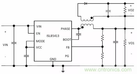 仍然運用通過耦合電感器或變壓器生成次級輸出這個概念,但二次側可以按不同方式配置,以生成正或負的次級電壓。為了生成正次級輸出,要將變壓器/耦合電感器和二次側二極管的極性反過來。圖3顯示了隔離式降壓拓撲生成兩個+VOUT軌。