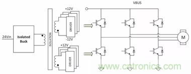 圖13. 使用隔離式降壓轉換器、具有隔離式IGBT柵極驅動偏置的3相逆變器