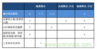 正如以上討論的,根據(jù)不同的輸入電壓軌,設計工程師可以選擇不同的拓撲,來提供適用于各種應用的電源軌。表1總結了適合不同應用的拓撲。