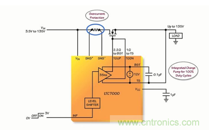 開關(guān)損耗。其內(nèi)部充電泵全面強(qiáng)化一個外部 N 溝道 MOSFET 開關(guān),因而使之能無限期地保持導(dǎo)通。
