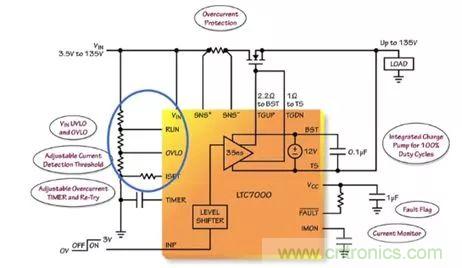 LTC7000 能夠避免負(fù)載遭受 VIN 引腳上的過壓和欠壓情況的損壞。“一個連接在 VIN 和地之間、且抽頭連接至 RUN 和 OVLO 引腳的簡單電阻分壓器將設(shè)定一個針對負(fù)載的有效操作窗口。當(dāng) VIN 位于由 RUN 和 OVLO 引腳所設(shè)定的操作窗口之外時,則關(guān)斷外部 MOSFET,并保護(hù)負(fù)載免遭潛在損壞或發(fā)生故障。” Mark Mullen這樣談到。