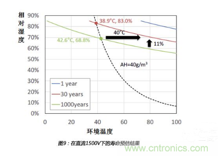 通過以上壽命預(yù)估模型,可以預(yù)估3.3kV IGBT在不同工況下的壽命。圖9展示了壽命預(yù)估結(jié)果,包含了在直流1500V下1年、30年和1000年的溫度濕度矯正曲線。通過這些曲線,我們可以看到3.3kV IGBT有足夠強(qiáng)的抵御濕度能力。