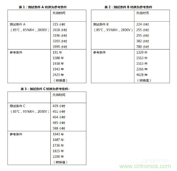 這里,參考條件定義為RHu=75%,Tu=25℃和Vu=1500V。通過公式(1),可以得到測(cè)試條件A中的加速因子αf_A為5.31k,測(cè)試條件B中的加速因子αf_B為52.0k,測(cè)試條件C中的加速因子αf_B為32.8k。綜合這些加速因子,溫濕反偏試驗(yàn)測(cè)試A、測(cè)試B和測(cè)試C轉(zhuǎn)換為如表1、表2和表3所示的參考條件。