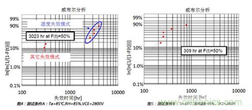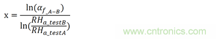 如圖4所示,在測(cè)試條件A的平均壽命為3023個(gè)小時(shí)。同樣,如圖5所示,在測(cè)試條件B的平均壽命為309個(gè)小時(shí)。所以,從相對(duì)濕度85%到相對(duì)濕度95%,加速因子αf_A-B通過計(jì)算為3023/309=9.78。相對(duì)濕度的經(jīng)驗(yàn)影響因子x通過下式計(jì)算: