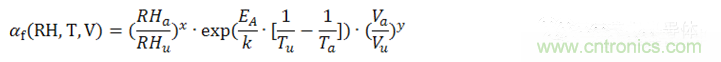 公式中,αf為測(cè)試的加速因子,也就是加速(后綴為a)測(cè)試條件下MTTF(Mean Time To Failures,平均無故障時(shí)間)與參考(后綴為u)測(cè)試條件下MTTF之比。EA是活化能,在0.79eV和0.95eV之間,k為玻爾茲曼常數(shù)。指數(shù)x為相對(duì)濕度的影響,指數(shù)y為電壓的影響,都是經(jīng)驗(yàn)數(shù)據(jù),但是必須通過實(shí)際評(píng)估來確認(rèn)。我們把此加速模型擴(kuò)展到壽命預(yù)估模型中。