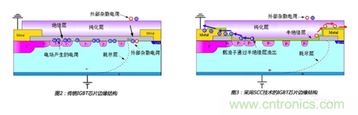 為了抑制IGBT芯片邊緣電荷集聚,SCC技術(shù)采用了優(yōu)化的半絕緣性材料替代傳統(tǒng)的絕緣材料,這個(gè)半絕緣性層為集聚的載流子提供了通路,如圖3所示,在高濕工況下,產(chǎn)生的載流子會(huì)通過半絕緣層傳遞出去,避免了電荷的大量集聚。