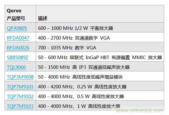 Qorvo 的小信號(hào)產(chǎn)品系列線性度高,功耗低,噪音小,尺寸小,極其便于集成。這一系列包括發(fā)送線性放大器、增益模塊和可變?cè)鲆娣糯笃?,以及衰減器、開(kāi)關(guān)、濾波器、雙工器和低噪聲放大器。少數(shù)此類(lèi)解決方案包含: