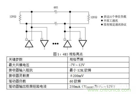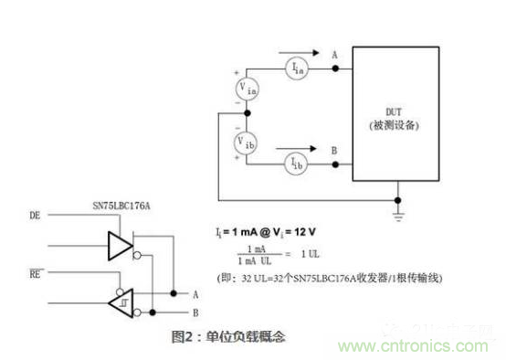 2.1.2單位負(fù)載概念掛接在同一485通訊總線上的驅(qū)動(dòng)器和接收器,其最大數(shù)量取決于它們的負(fù)載特性。驅(qū)動(dòng)器和接收器的負(fù)載都是相對(duì)單位負(fù)載而衡量的。485標(biāo)準(zhǔn)規(guī)定一根傳輸總線上最多可以?huà)旖?2個(gè)單位負(fù)載。單位負(fù)載定義為:在12V共模電壓環(huán)境中,允許通過(guò)穩(wěn)態(tài)負(fù)載1mA電流,或者是在-7V共模電壓環(huán)境中,允許通過(guò)穩(wěn)態(tài)負(fù)載0.8mA電流。單位負(fù)載可能由驅(qū)動(dòng)器、接收器和失效保護(hù)電阻組成,但不包括AC終端匹配電阻。