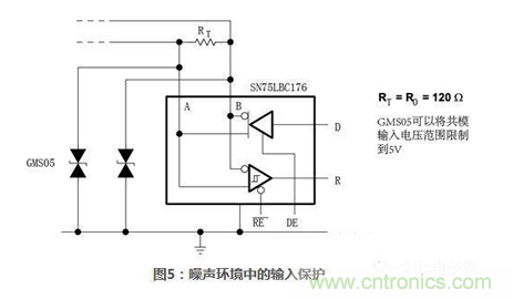 電流隔離能夠提供更好的系統(tǒng)級(jí)保護(hù),但是價(jià)格也更高。更流行并且比較便宜的方案是使用二極管保護(hù)。使用二極管方法代替電流隔離是一種折衷方法,在更低層次上提供保護(hù)。外接二極管和內(nèi)部集成瞬態(tài)保護(hù)二極管的例子如下圖所示:圖5所示485收發(fā)器SN75LBC176外接二極管來(lái)防止瞬態(tài)毛刺。