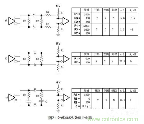 使用這樣的內(nèi)部上下拉電阻允許總線不進(jìn)行終端匹配,但是會(huì)顯著的降低最大信號(hào)速率和可靠性。圖7給出了一些485接口通用外置失效保護(hù)電路,每個(gè)電路都盡力維持接收器輸入端電壓不小于最小臨界值并在一個(gè)或多個(gè)故障條件(開(kāi)路、空閑、短路)下,維持一個(gè)已知的邏輯狀態(tài)。